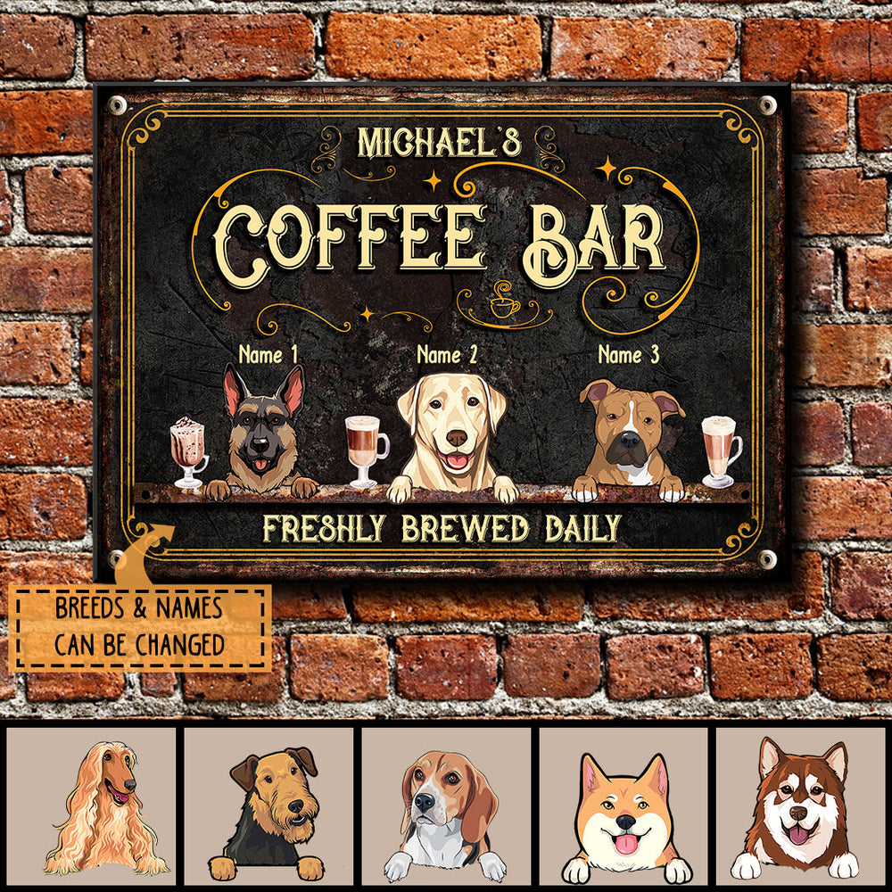 Coffee Bar Freshly Brewed Daily, Vintage Sign, Dog & Beverage, Personalized Dog Breeds Metal Sign