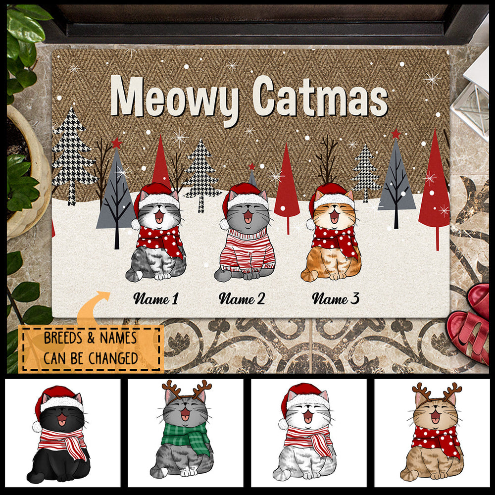 Meowy Catmas, Argyle Pattern Coir Yarn, Personalized Cat Christmas Doormat
