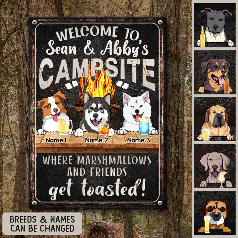Welcome To Family Camp Site, Where Marshmallows And Friends Get Toasted, Dog & Beverage, Personalized Dog Lovers Metal Sign